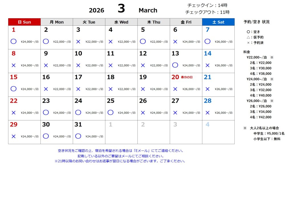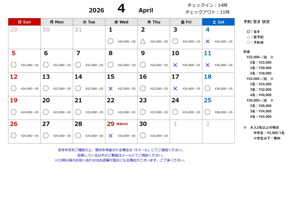① 空き状況と料金を確認して、Eメール:sh-cozy@ymail.ne.jp宛てに予約するための情報をお知らせください。